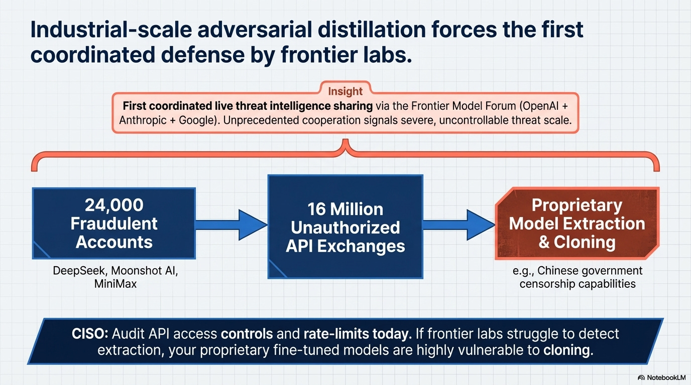 Why it matters: Three companies that compete on everything else just agreed to share threat intelligence. That only happens when the problem is too large for individual defenses. The 16 million exchanges through 24,000 fraudulent accounts confirm that adversarial distillation (using a competitor’s API to train a cheaper clone) is happening at industrial scale. If the labs themselves struggle to detect unauthorized model extraction in real time, what does that say about the proprietary data flowing through those same APIs?