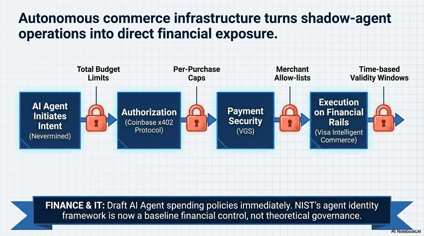 What happened: On April 9, Nevermined integrated Visa Intelligent Commerce, Coinbase’s x402 protocol, and VGS payment security to allow AI agents to autonomously purchase digital goods and services using registered Visa cards. The system includes guardrails: total budget limits, per-purchase caps, merchant restrictions, and time-based validity windows.