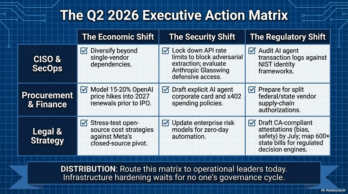 What to do: If you’re an Anthropic customer, ask about Glasswing eligibility and what defensive capabilities it unlocks for your security team. If you’re evaluating model vendors, the revenue trajectory says something about adoption velocity. Get a briefing before your next vendor decision locks in.