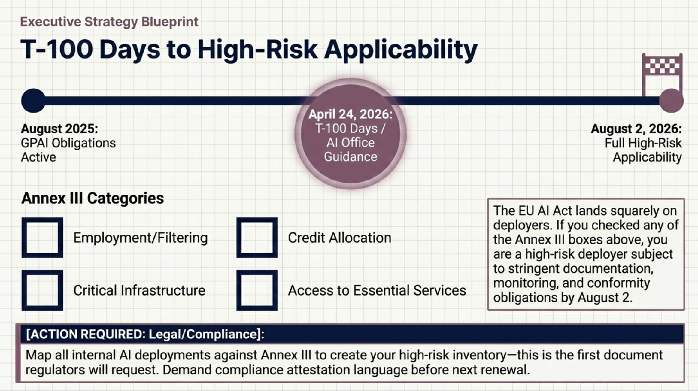 What happened: August 2, 2026 is the full applicability date for high-risk AI systems under the EU AI Act — Annex III categories including employment, education, critical infrastructure, and access to essential services. GPAI obligations have been in force since August 2025; this next milestone is the high-risk operational deadline. April 24 marked T-100, and the AI Office is publishing implementation guidance through April and May.