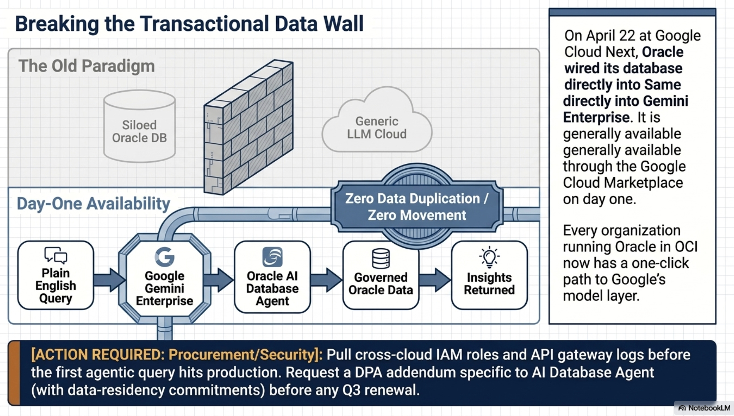 Why it matters: I have spent ten years watching enterprises wall off transactional Oracle data from anything resembling an LLM. That wall just got a nice big door and it is a door Oracle and Google walked through together, at a keynote, with marketplace availability on day one. Every organization running Oracle in OCI now has a one-click path to Google’s model layer, which means cross-cloud IAM, query lineage, and data residency become an audit problem this quarter.