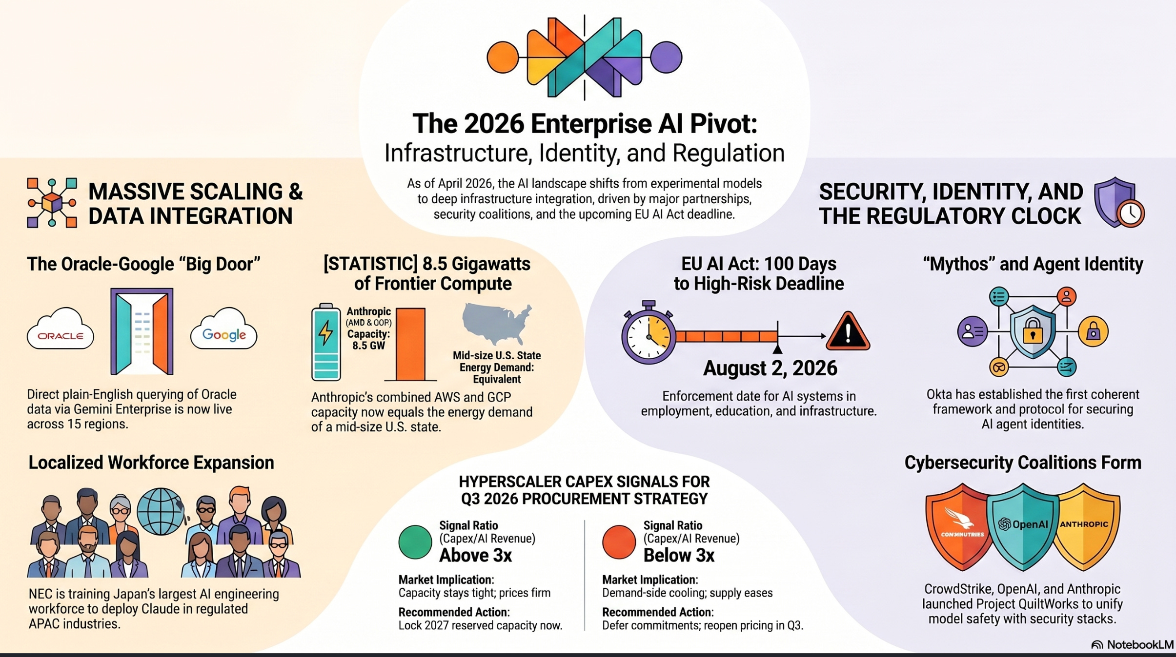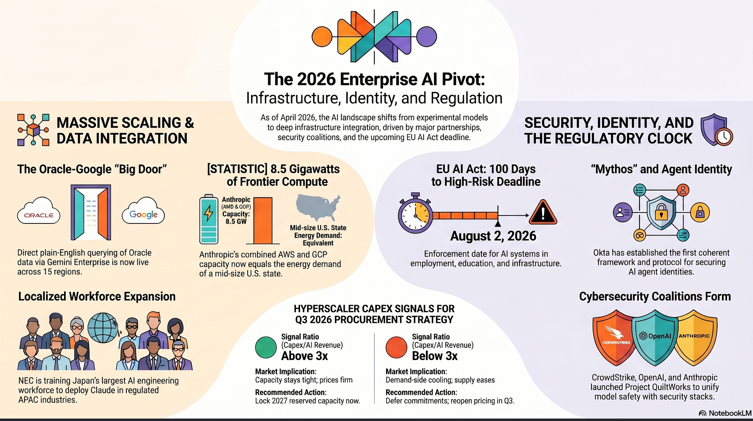 Good morning. This week Oracle wired its database into Google’s Gemini Enterprise, Anthropic locked in another five gigawatts of compute with Amazon and signed Japan’s largest AI workforce deal with NEC, and two security vendors used RSAC pre-week to claim the agent-identity slot. The EU AI Act enforcement clock crossed 100 days to high-risk applicability. The fun story is how fast the bills are coming due on what was bought in 2024 and 2025.