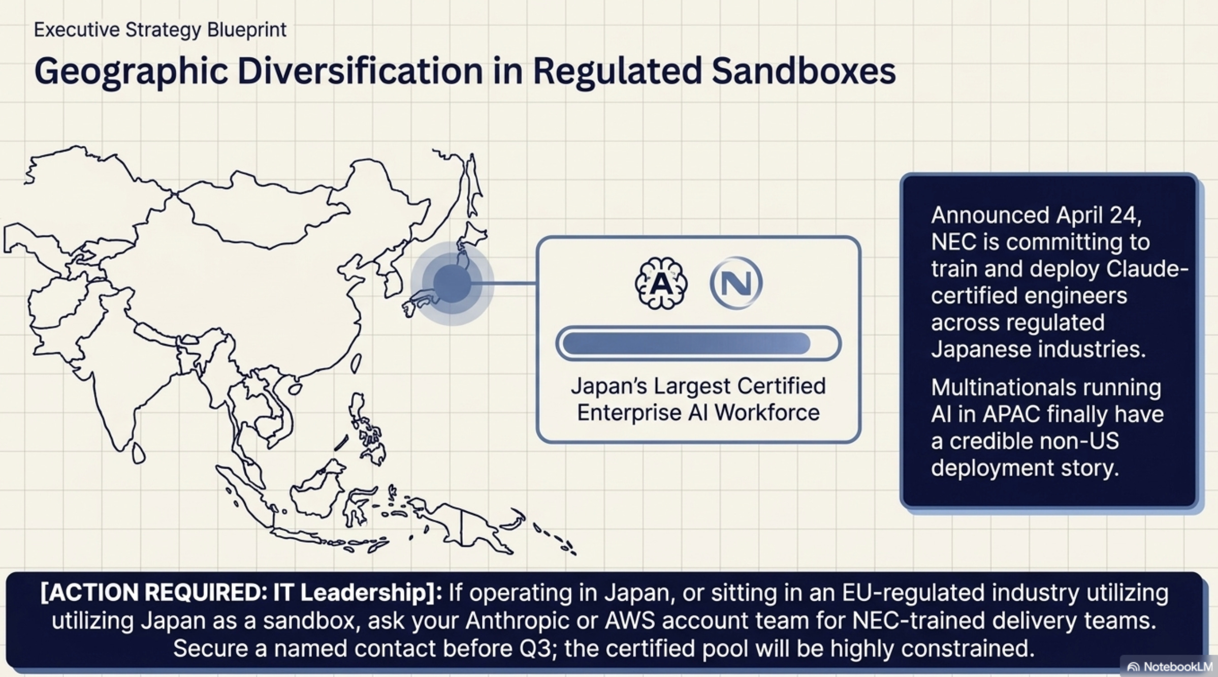 What to do: If you have Japan operations, or sit in an EU regulated industry watching Japan as a sandbox jurisdiction, ask your Anthropic or AWS account team about NEC-trained delivery teams. Get a named contact before Q3. The certified pool will be small for the first six months.