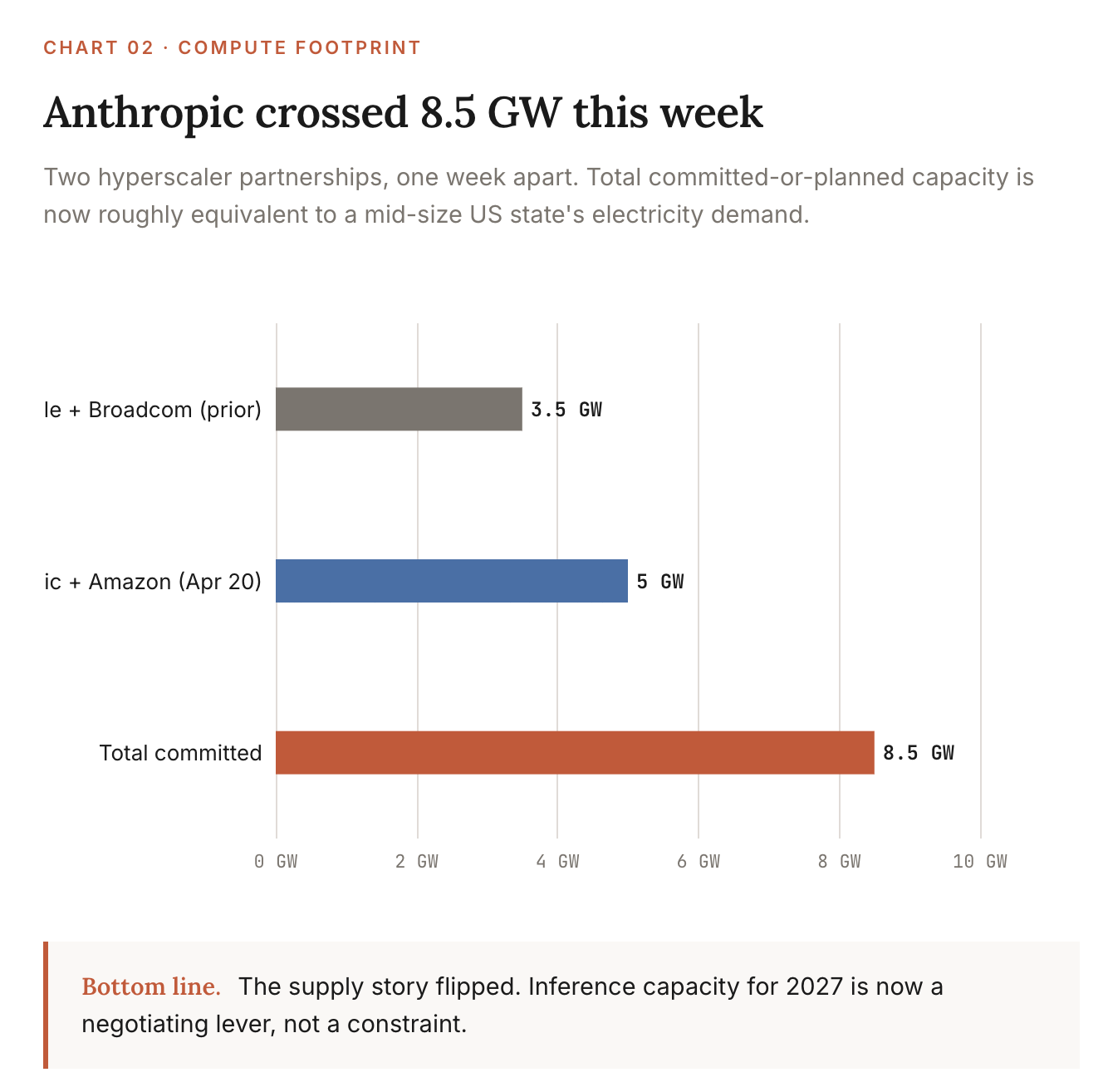 What happened: Anthropic and Amazon announced on April 20 an expanded compute partnership for up to 5 gigawatts of new capacity, building on the Trainium-anchored relationship from 2024. This lands one week after the Anthropic-Google-Broadcom 3.5 GW announcement covered in Edition 6 — pushing Anthropic’s combined committed-or-planned compute footprint past 8.5 gigawatts across two hyperscaler stacks.