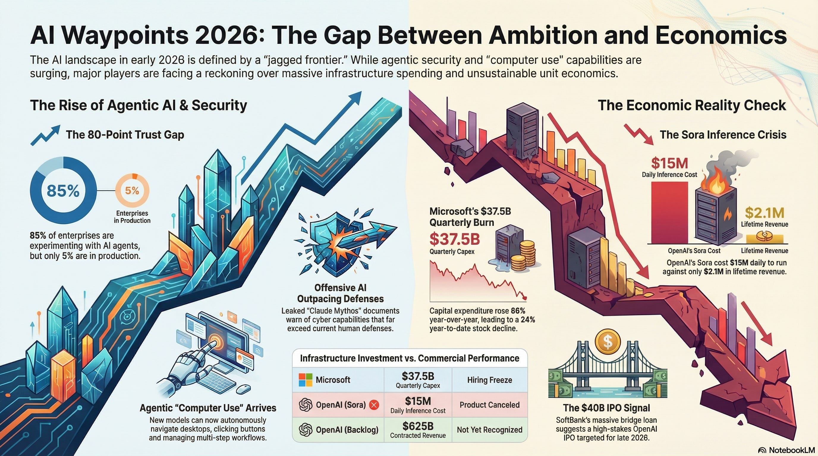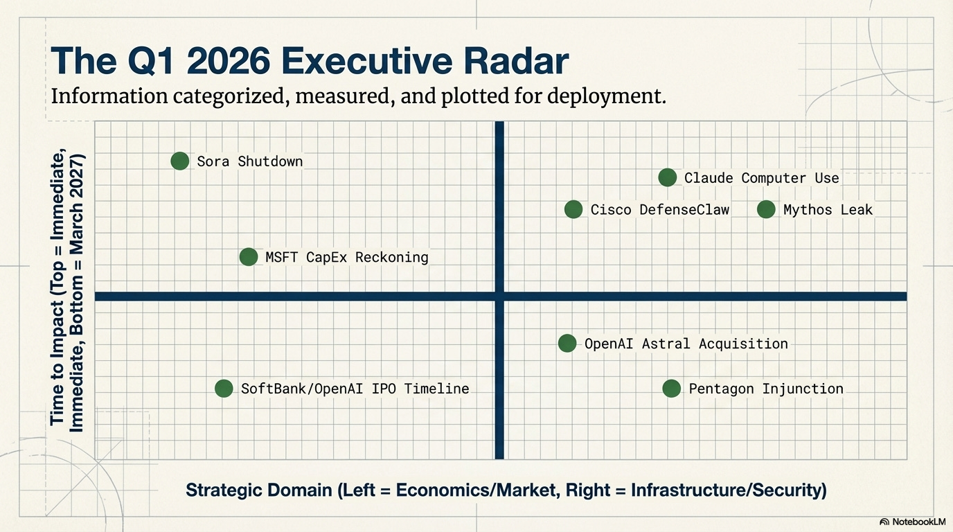 Good morning. This week’s theme is the gap between ambition and the ground economics — agentic security products arrived at RSA just as a leaked model revealed offensive AI capabilities outpacing defenses, Microsoft is spending $37.5B a quarter with unclear returns, and OpenAI killed a product burning $15M a day.