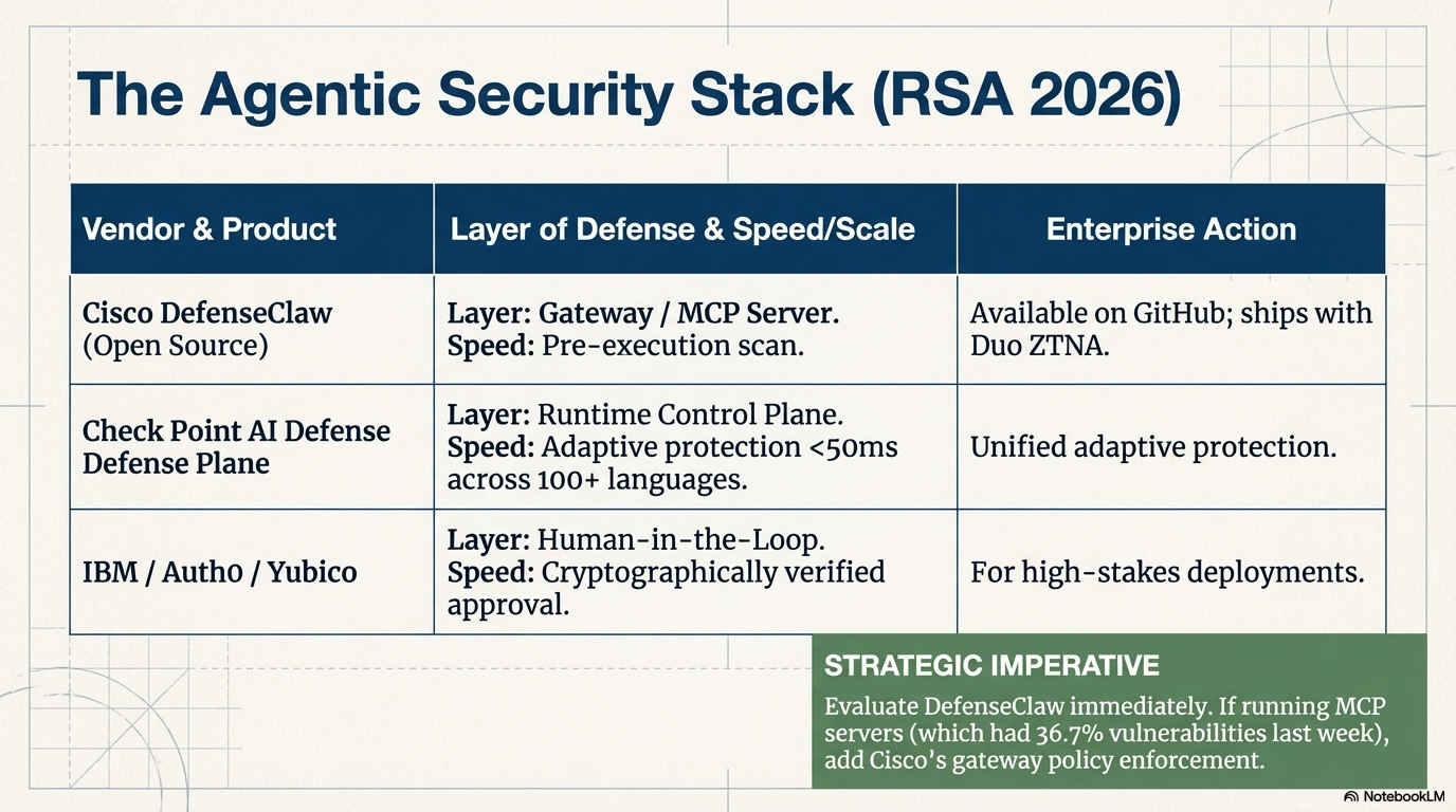 What happened: RSA Conference (March 23-26, San Francisco) was wall-to-wall agentic AI security. Cisco launched DefenseClaw, an open-source framework that scans every skill, plugin, and Model Context Protocol (MCP) server — the connectors that let AI agents reach enterprise tools and data — before an agent executes. Runtime monitoring is included; available on GitHub March 27. Cisco also shipped zero-trust network access (ZTNA - the principle that no user or system is trusted by default) for AI agents via Duo identity management and an Agent Runtime SDK supporting Bedrock, Vertex, Azure AI Foundry, and LangChain. Check Point launched AI Defense Plane: a unified control plane with adaptive protection in under 50ms across 100+ languages. IBM, Auth0, and Yubico introduced a Human-in-the-Loop framework requiring cryptographically verified human approval for high-stakes agent actions.
