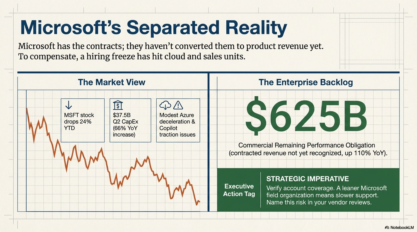 Why it matters: One question is driving the stock decline: when does $37.5B per quarter in AI infrastructure spending start showing up in product revenue? The Copilot traction problem is familiar — we flagged the leadership restructuring two editions ago — but the spending scale changes the stakes. The $625B backlog number is enormous and largely unreported. Microsoft has the contracts. It just hasn’t converted them yet. For enterprise customers, the hiring freeze is a practical problem: a leaner Microsoft field organization means less account coverage and slower support response.