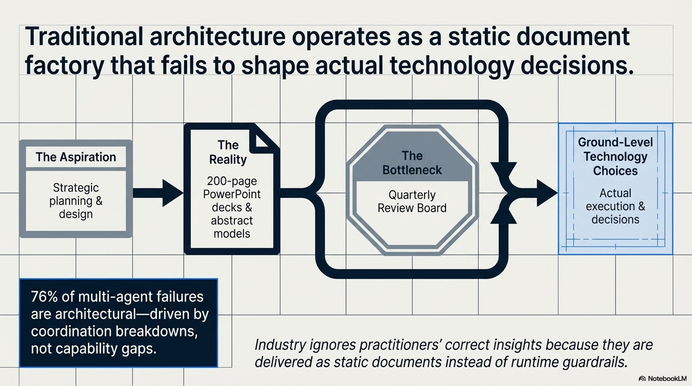 76% of multi-agent failures are architectural: coordination breakdowns, not capability gaps. Bounding what each agent can do is an EA principle. EA practitioners have preached dependency mapping for 20 years. The industry ignored them because EA delivered this insight as 200-page PowerPoint decks instead of runtime guardrails.