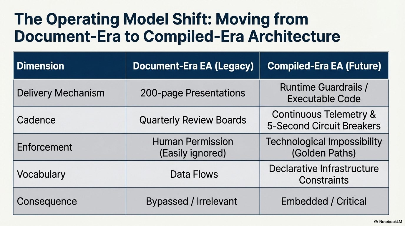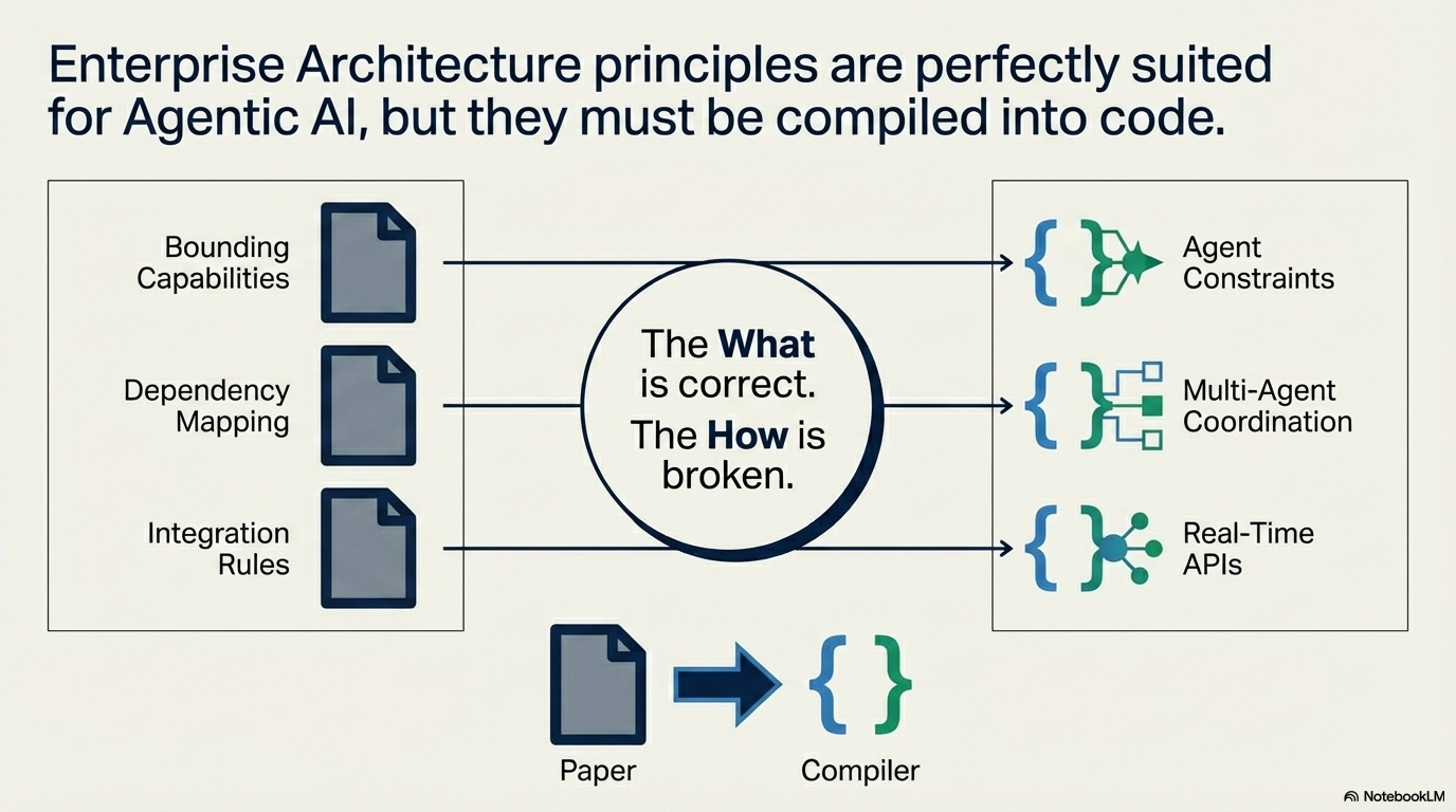 The principles EA has championed for decades are exactly what agentic AI systems need. But those principles must be compiled: turned from static documents into constraints that execute at the speed of the systems they govern.