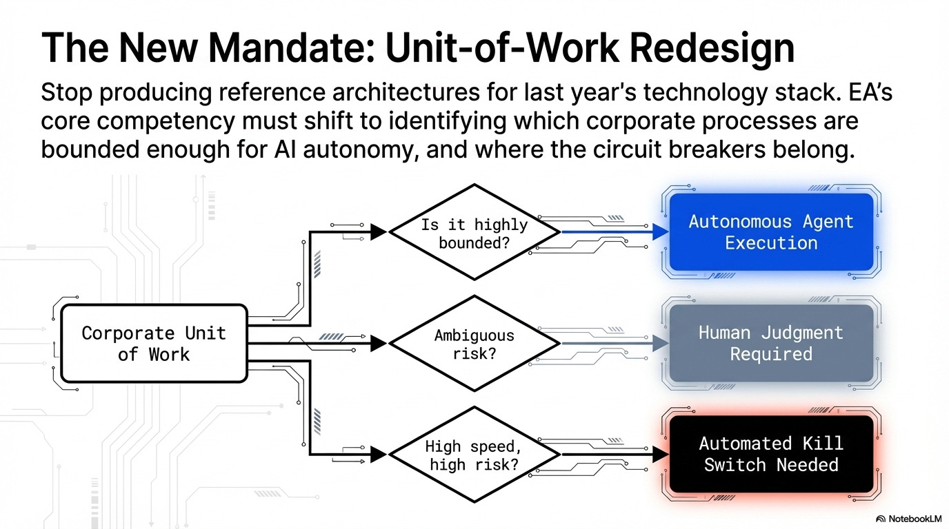 In practice: EA should be identifying which units of work to redesign for AI agents: which processes are bounded enough for autonomous execution, which require human judgment, which need kill switches. Instead, most EA teams are producing reference architectures for last year’s technology stack while platform teams do the actual redesign.