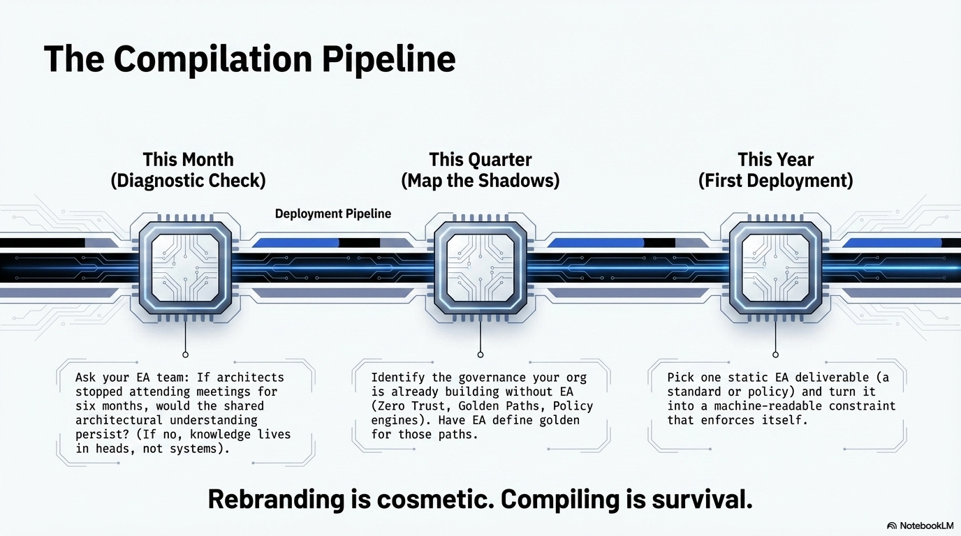 This quarter, find the governance your organization is already building without EA. Golden paths. Policy engines. Zero Trust architecture. Compliance-as-code. These are EA functions being performed by other teams. The choice is whether EA defines what “golden” means in those golden paths, or gets defined out of relevance.
