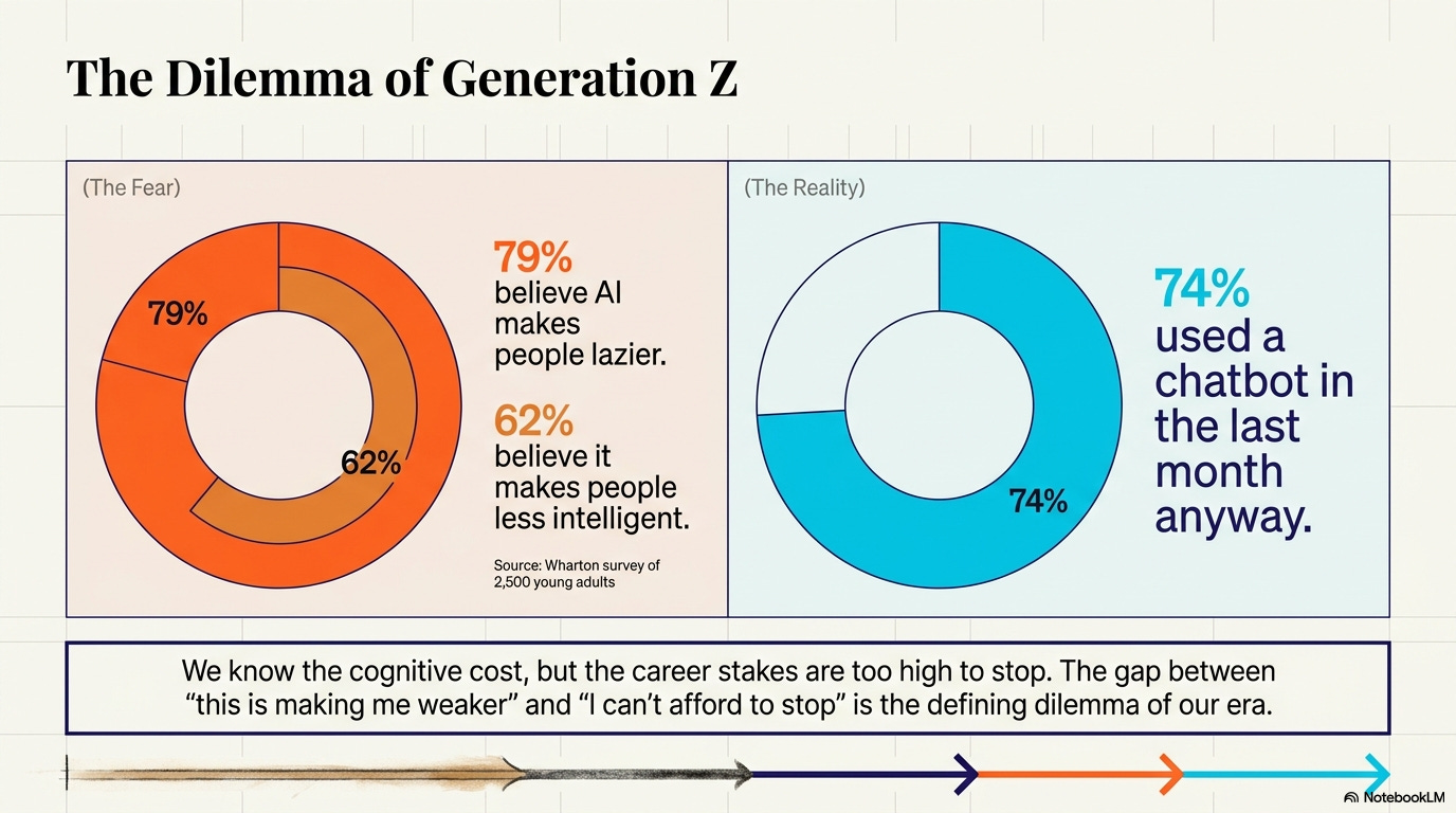 A separate Wharton survey of 2,500 young adults found 79% believe AI makes people lazier and 62% believe it makes people less intelligent.