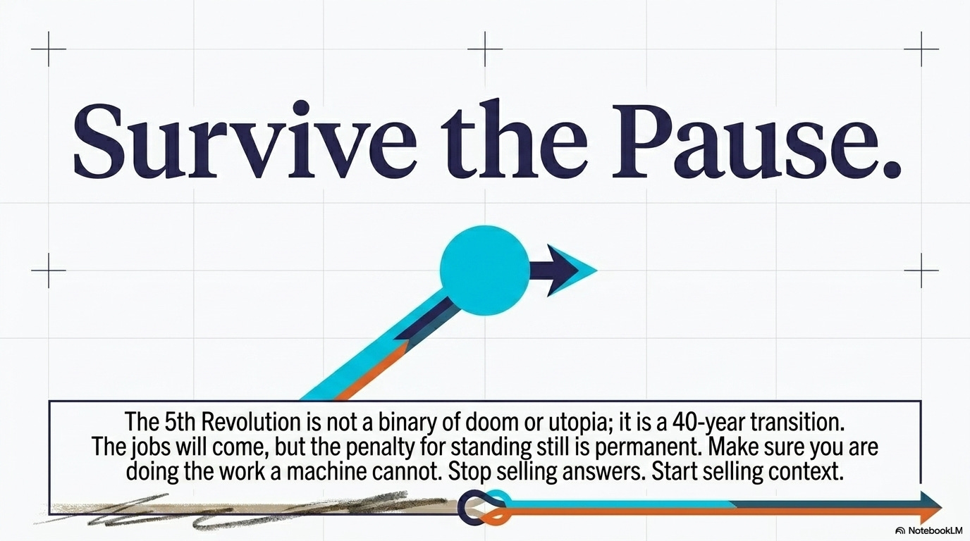 If you’ve read the first four revolutions carefully, you know what this means. The organizational redesign hasn’t happened yet. The electric motor phase. The central-shaft factory layout. The $10 in complementary change that organizations haven’t spent alongside their $1 in technology.