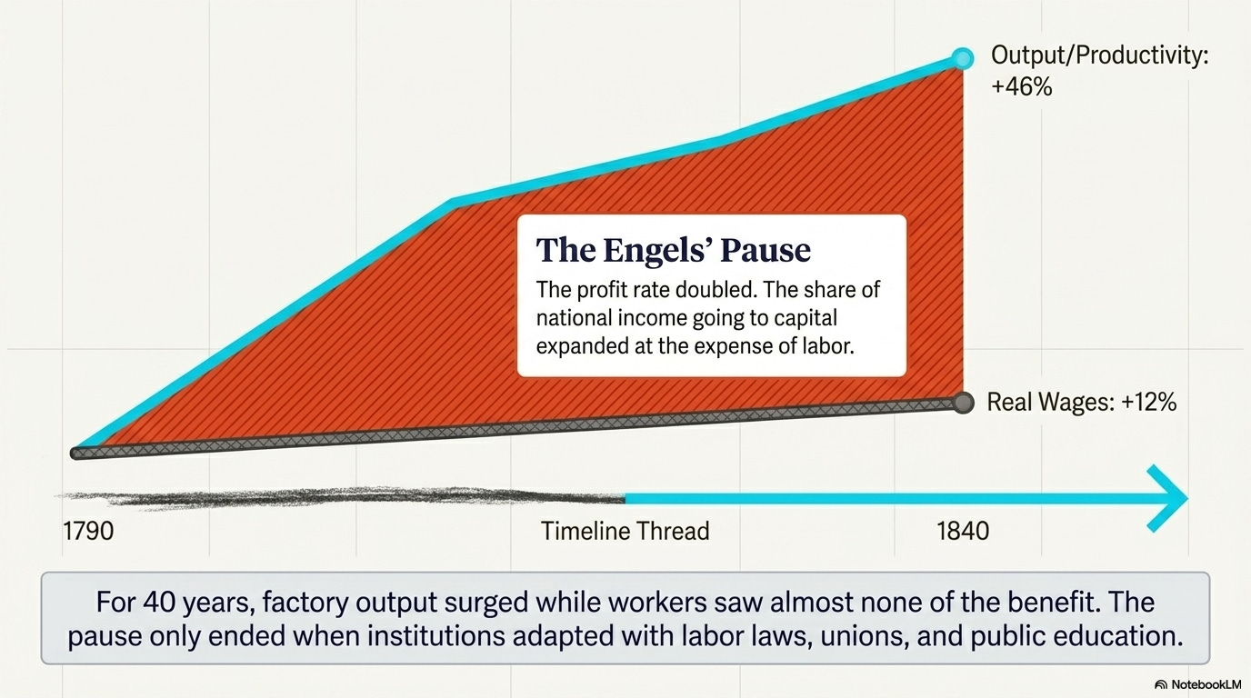 Imagine a factory that doubles its output. You’d expect the workers to get raises. For 40 years during the Industrial Revolution, they didn’t. Profits doubled while wages barely moved. Economist Robert Allen named this the “Engels’ Pause” after Friedrich Engels, who documented the misery firsthand. The pause eventually ended (wages grew even faster than productivity from 1840 to 1900) but only after major institutional changes: labor laws, unions, education reform.