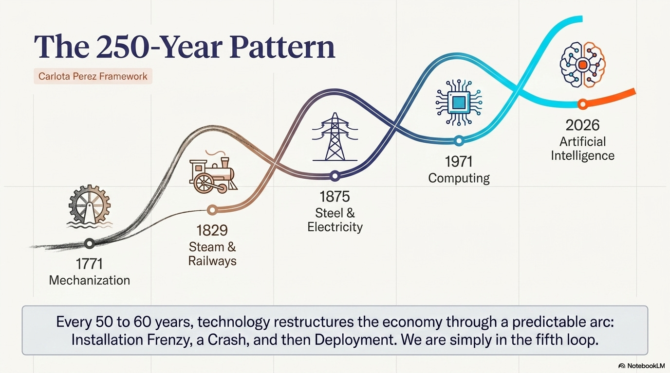 The economist Carlota Perez has spent her career documenting what she calls “great surges of development.” Her framework, published through Cambridge University Press in 2002, identifies a recurring pattern: