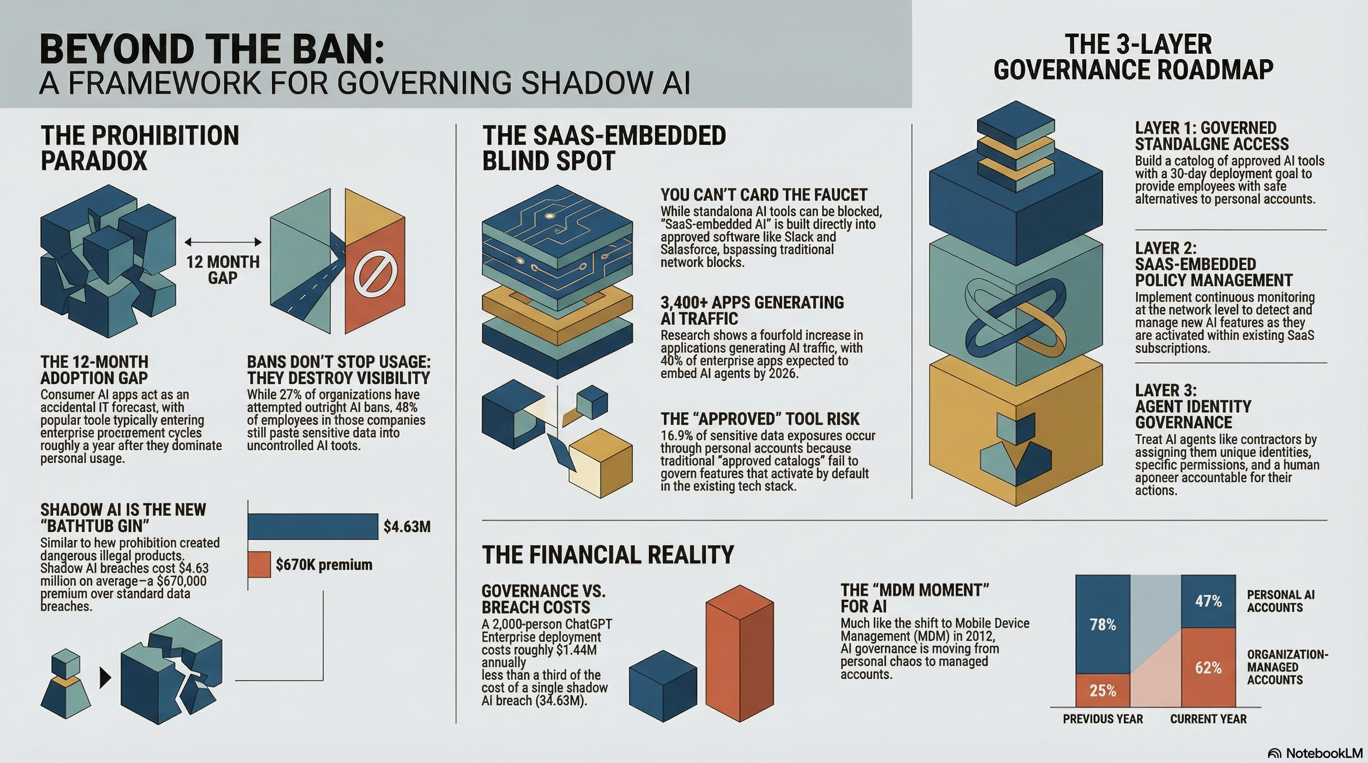 IBM’s 2025 Cost of Data Breach report quantified the damage: shadow AI breaches cost $4.63 million on average, a $670,000 premium over standard breaches. And 97% of organizations that experienced AI-related breaches lacked access controls. They weren’t breached because AI is inherently dangerous. They were breached because prohibition weakened the governance layer.