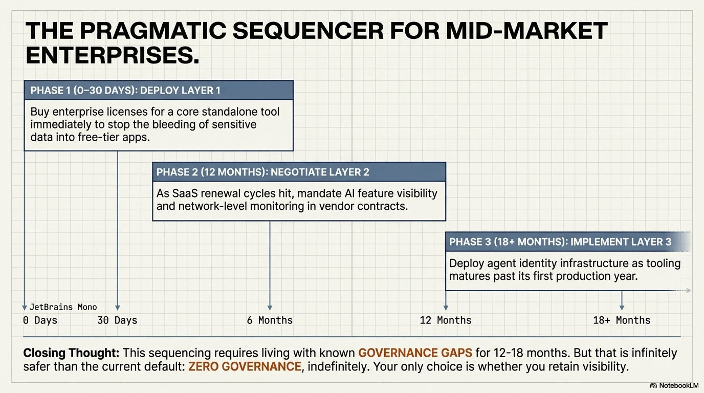 The honest sequencing is: Layer 1 first (get people a governed tool within 30 days), Layer 2 when the next SaaS renewal cycle hits (negotiate AI feature visibility into your contracts), and Layer 3 when the tooling matures past its first production year.