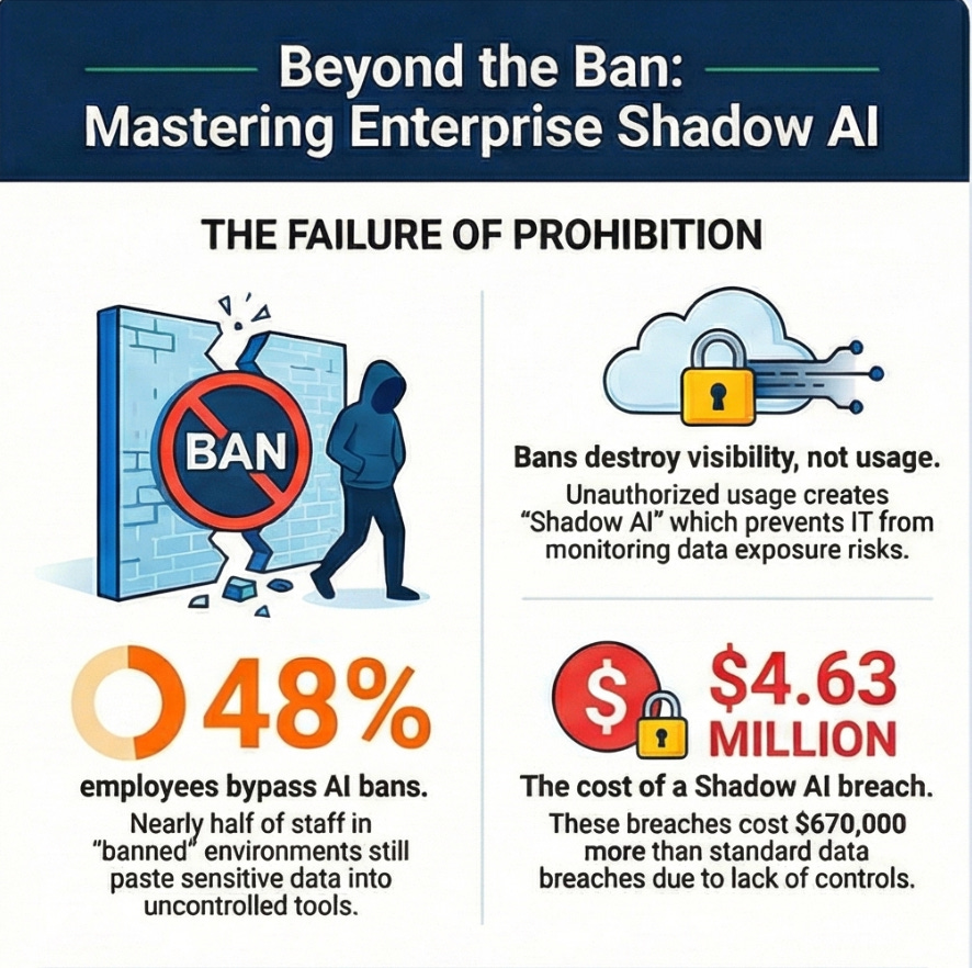 The parallel to enterprise AI bans is almost exact. Twenty-seven percent of organizations have tried outright AI bans. Among those organizations, 48% of employees still paste sensitive data into uncontrolled AI tools.